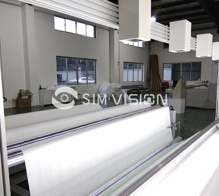 針對無紡布本身厚薄不均、結(jié)構(gòu)稀疏不均的材料特性以及瑕疵分布的隨機(jī)性(無紡布的正面、反面及中間),傳統(tǒng)的透射打光方式容易造成系統(tǒng)的漏檢及誤報(bào)。賽默斐視SIMV無紡布污點(diǎn)檢測儀采用無影亮場組成檢測環(huán)境,即一根光源在材料下方透射,另外一根光源在材料上方反射,在生產(chǎn)線開始運(yùn)行時(shí),CCD相機(jī)根據(jù)編碼器采集的速度信號進(jìn)行同步掃描拍攝,將采集到的圖像通過SIMV圖像分析軟件算法進(jìn)行動態(tài)欲知分割,通過瑕疵圖像與正常產(chǎn)品的灰階差異,從而發(fā)現(xiàn)瑕疵并做進(jìn)行報(bào)警、統(tǒng)計(jì)、分類、記錄等操作。